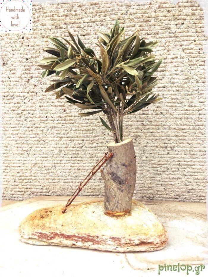 Διακοσμητικό δέντρο ελιάς με σκάλα πάνω σε πέτρα. Χρυσοπράσινα φύλλα ελιάς και σκαλίτσα από λεπτά ξυλάκια.