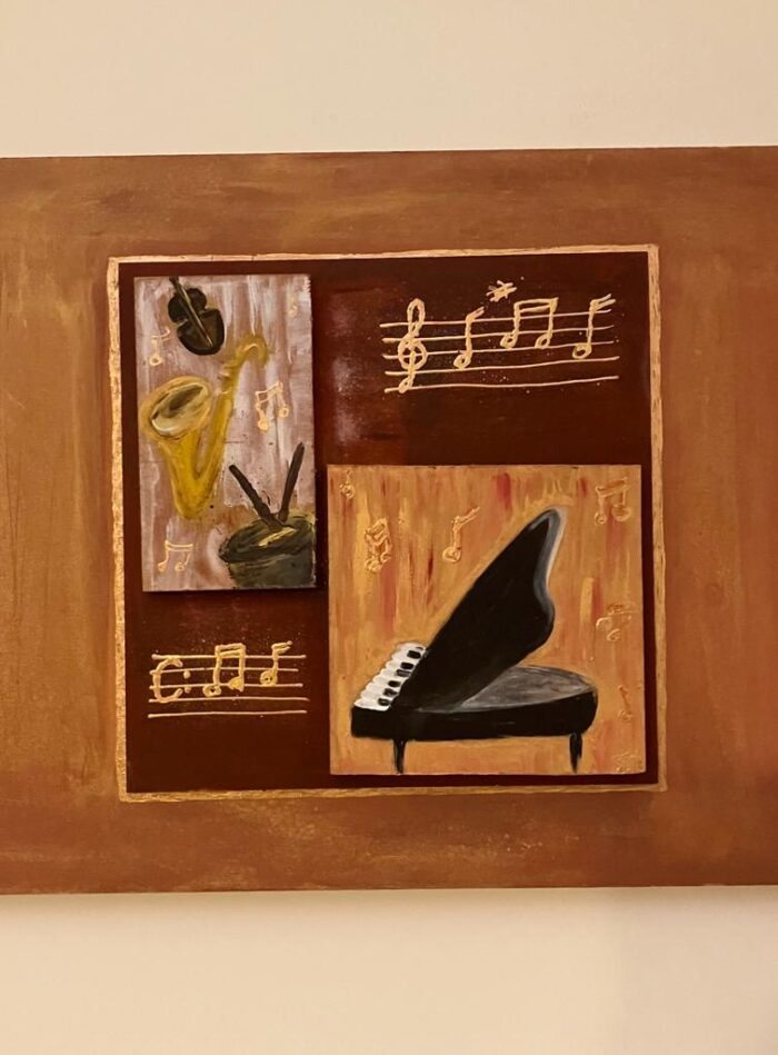 Κάδρο τριλογία με μουσικά όργανα. Μεικτή τεχνική με λάδι και τέμπερα.